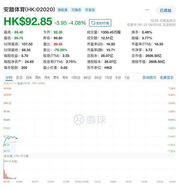 当日,安踏体育以91.15港元的价格大幅低开,直接反映了市场对该事件的负面情绪。不过,在股价触底后,部分资金或有抄底意图,开盘后的十分钟内股价出现短暂反弹,并呈现震荡上行走势,一度由91.15港元回升至93.00港元。尽管盘初有所拉升,但整体走势依旧疲软,未能扭转低开的局面。